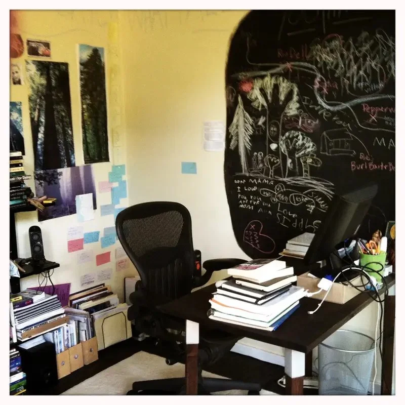 When I wrote my novel Tree Dreams, I gave myself permission to use my entire studio. I painted a wall with chalkboard paint and wrote all over it. I plastered magazine clippings and notecards everywhere so I could “see” what I was thinking (and my then 5-year old left me sweet messages, too). It felt so satisfying to break the rules and let creativity reign (that’s a photo of my studio on the left).